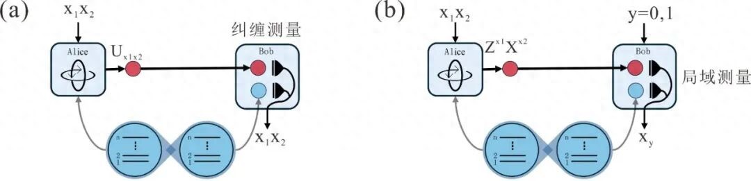 (a) 量子密集编码和 (b) 基于纠缠的随机通信框架原理示意图