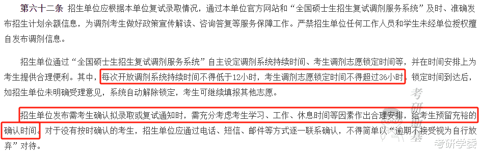 此外,《25年新规》中仍然强调:“招生单位发布需考生确认拟录取或复试通知时,需充分考虑考生学习、工作、休息时间等因素作出合理安排,给考生预留充裕的确认时间。对于没有按时确认的考生,招生单位应通过电话、短信、邮件等方式逐一联系确认。”这一规定,避免了往年出现过的“深夜发送调剂录取通知、两小时内确认”等不合理的调剂操作。