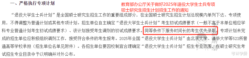 (图片截自《教育部办公厅关于做好2025年退役大学生士兵专项硕士研究生招生计划招生工作的通知》)