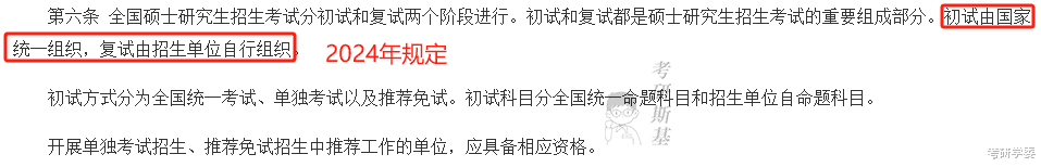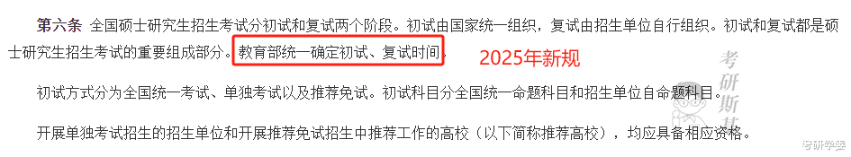 《25年新规》第六条明确指出:由教育部统一确定25考研复试时间。而24年的规定是:初试由国家统一组织,复试由招生单位自行组织。