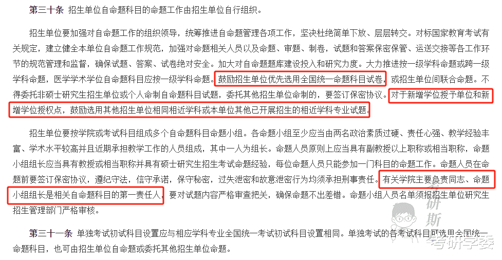 《25年新规》对于自主命题科目的出题要求更严格、对其命题人员要求也更具体。25年新增表述:“对于新增学位授予单位和新增学位授权点,鼓励选用其他招生单位相同相近学科或本单位其他已开展招生的相近学科专业试题”“有关学院主要负责同志、命题小组组长是相关自命题科目的第一责任人”。
