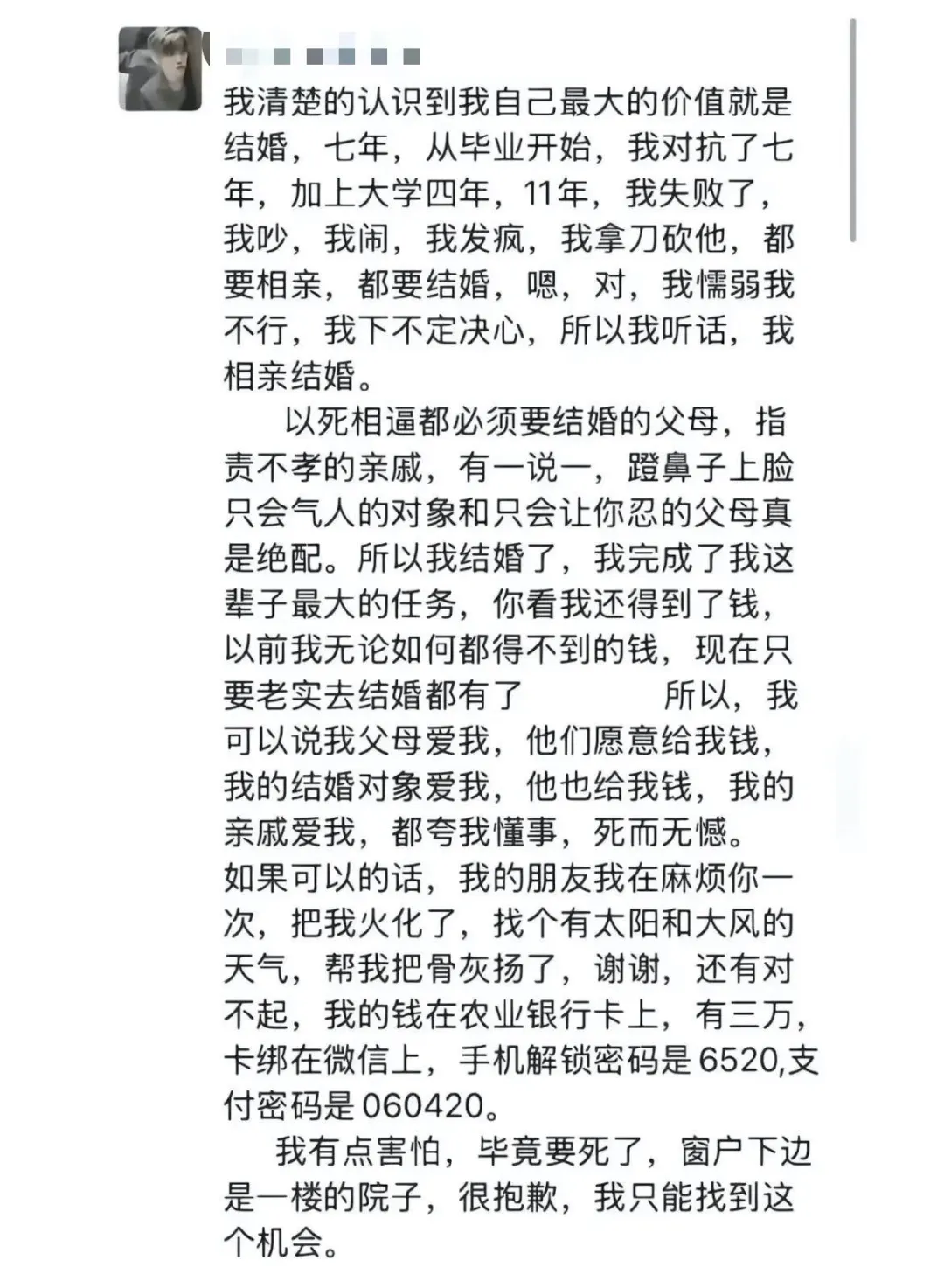 她的遗言里有一句话,刺痛了很多人:“以死相逼都要结婚的父母……所以我结婚了,我完成了我这辈子最大的任务。”