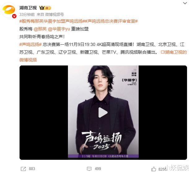 此次担任《声鸣远扬》总决赛评审,华晨宇将从年轻一代的音乐审美出发,为节目带来更多元的评审视角,也能更好地理解年轻选手的音乐表达,在专业评审与年轻观众喜好之间搭建起 “桥梁”。粉丝期待道:“想看花花从音乐创新角度点评选手,肯定能有很多不一样的精彩观点!”