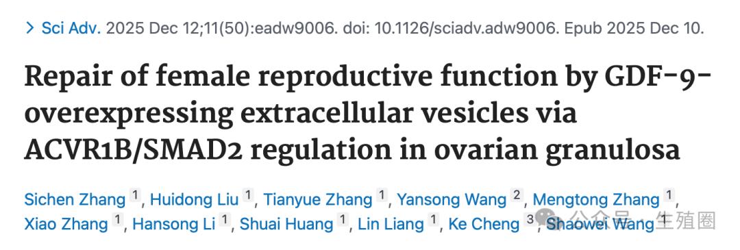 Repair of female reproductive function by GDF-9-overexpressing extracellular vesicles via ACVR1B/SMAD2 regulation in ovarian granulosa. Sci Adv. 2025 Dec 12;11(50):eadw9006. doi: 10.1126/sciadv.adw9006. Epub 2025 Dec 10.