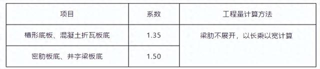 2.槽形板底、混凝土折瓦板、密肋板底、井字梁板底抹灰工程量按下表规定乘以系数计算: