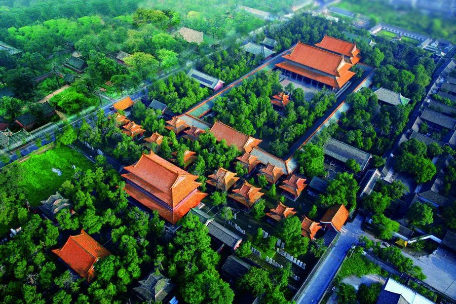 曲阜孔庙,始建于公元前478年,是一座规模庞大的祭祀孔子的庙宇,在孔子的故居上改建而成,是中国现存规模仅次于故宫的古建筑群。