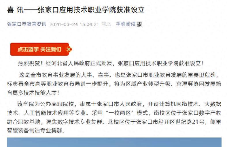 信息显示,该学院为公办高职院校,隶属于张家口市人民政府,开设计算机网络技术、大数据技术、人工智能技术应用等专业