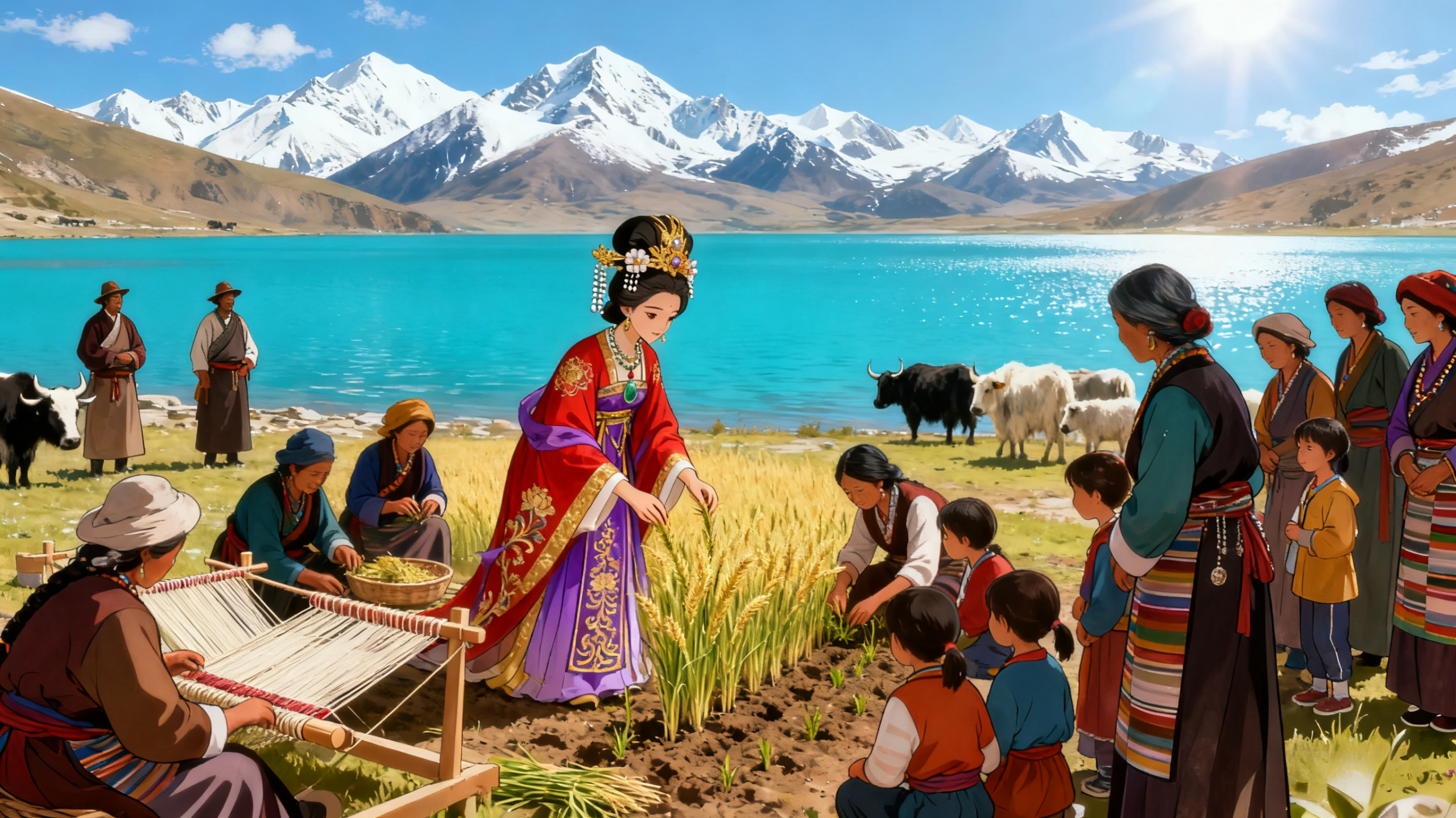 这段旅程长达三千多里,穿越戈壁、翻越雪山,历时数月。途中,文成公主每到一地,便留下技术与善意。她在青海湖畔教当地人种植小麦,在玉树传授纺织技艺,甚至亲自为牧民诊治疾病。