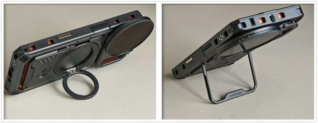 专用手机壳还能吸附多功能背板,巧妙“内置”了一把弹簧小刀,平时可以用来拆包裹或户外切割细绳。背板还带指环支架和立式支架,拍完视频“可横可竖“立在桌上观看回放,超级方便。