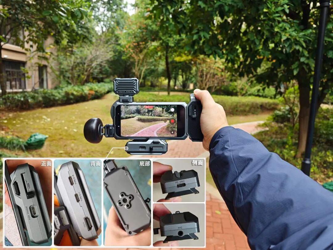 相比几个月前我测过的Pura 80 Ultra创作版套装,这次iPhone17 Pro创作者套装新增了一个通用拓展坞,不仅带有4个Type-C口(侧面C口支持100W PD快充),居然还带HDMI输出口和3.5mm话筒孔,可以实时将画面同步到外接显示器上,底部还保留了通用螺母口,不影响再装三脚架。
