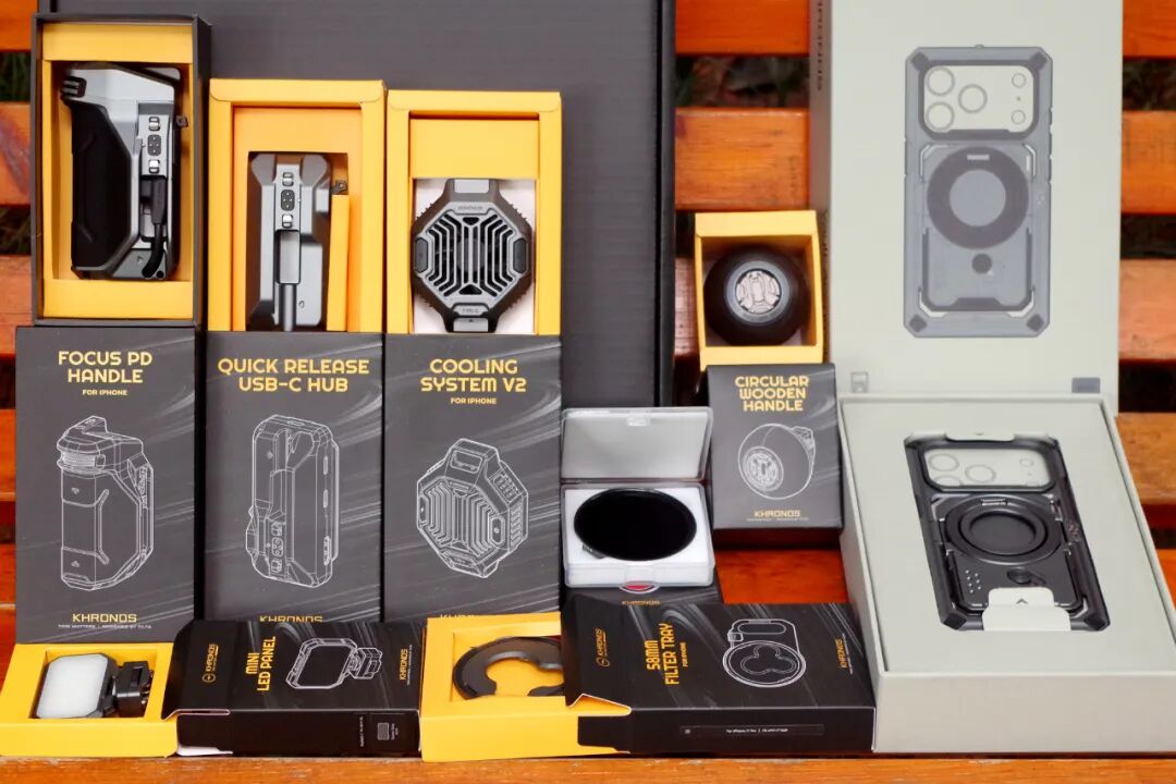 当我打开每个产品的包装,还是被如此众多的外设深深震撼,其中包含了专用手机壳、圆形侧手柄、通用拓展坞、磁吸散热器、跟焦供电手柄、专用58mm滤镜转接件、58mm磁吸滤镜、通用mini补光灯。