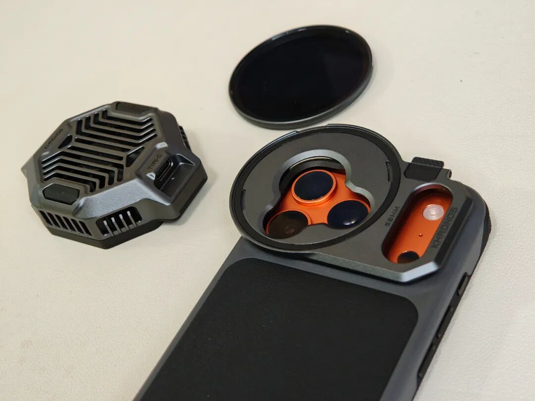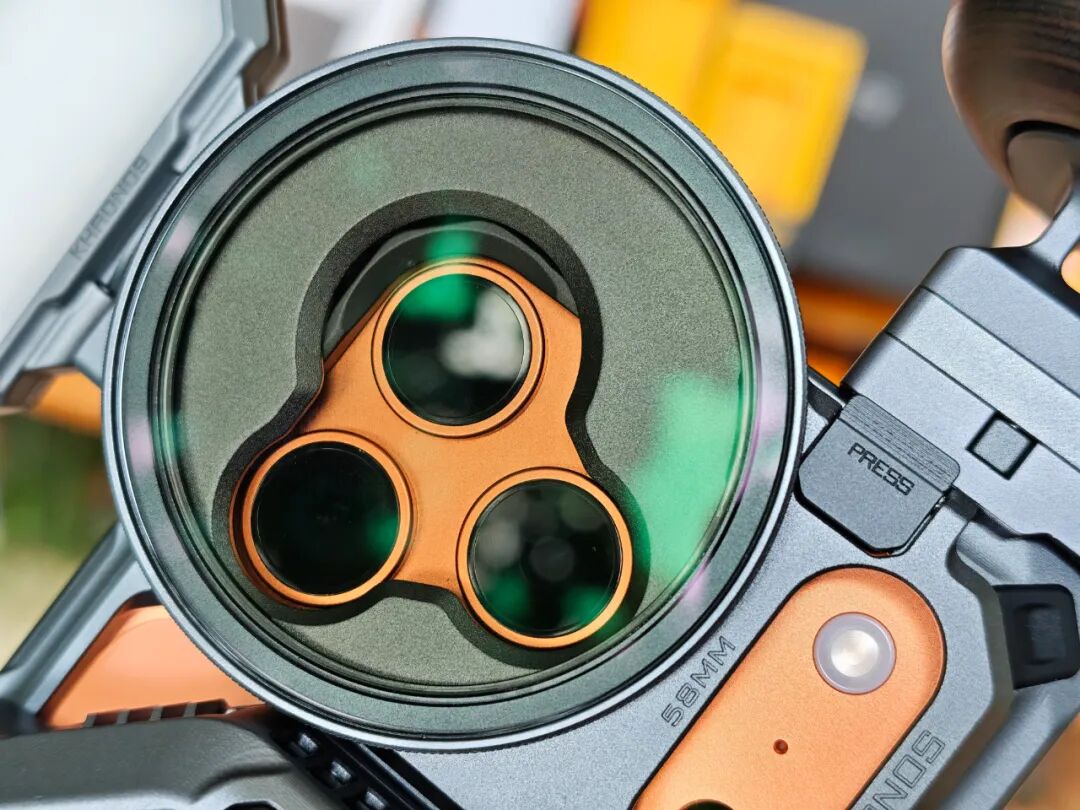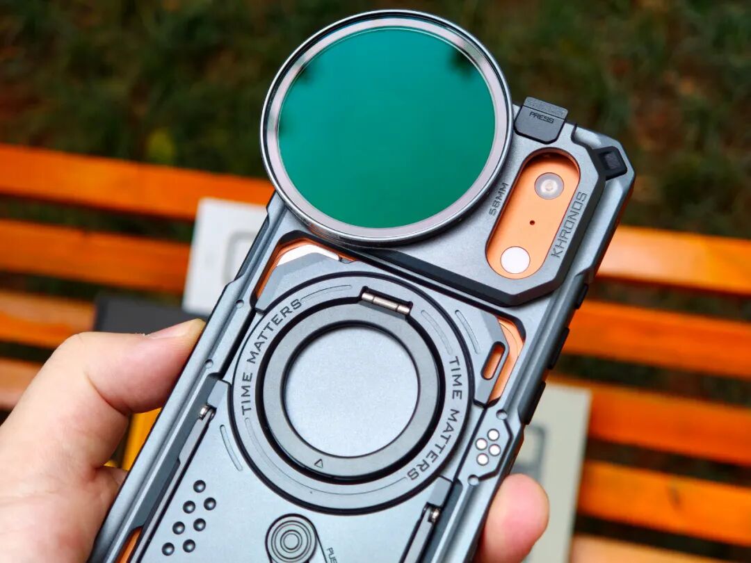 在KHRONOS经典创作者套装中,专用手机壳就是连接各类外设的纽带。只要将专用58mm滤镜转接件固定在摄像头孔位,再装上58mm磁吸滤镜(VND1-5档),就可以控制进光量,保留更多细节。此外还可以搭配CPL+1/2黑柔滤镜,减少反光,让画面或人像更柔和。