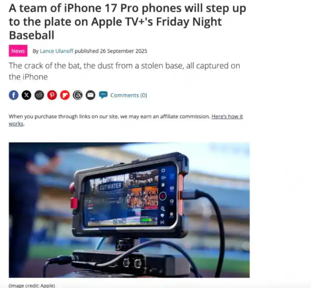 今年9月苹果推出了iPhone17 Pro,国外有一档名叫《周五棒球夜》的体育直播节目,破天荒采用三台iPhone17 Pro多角度直播职业棒球大赛,无不证明了iPhone17 Pro的强大影像实力。