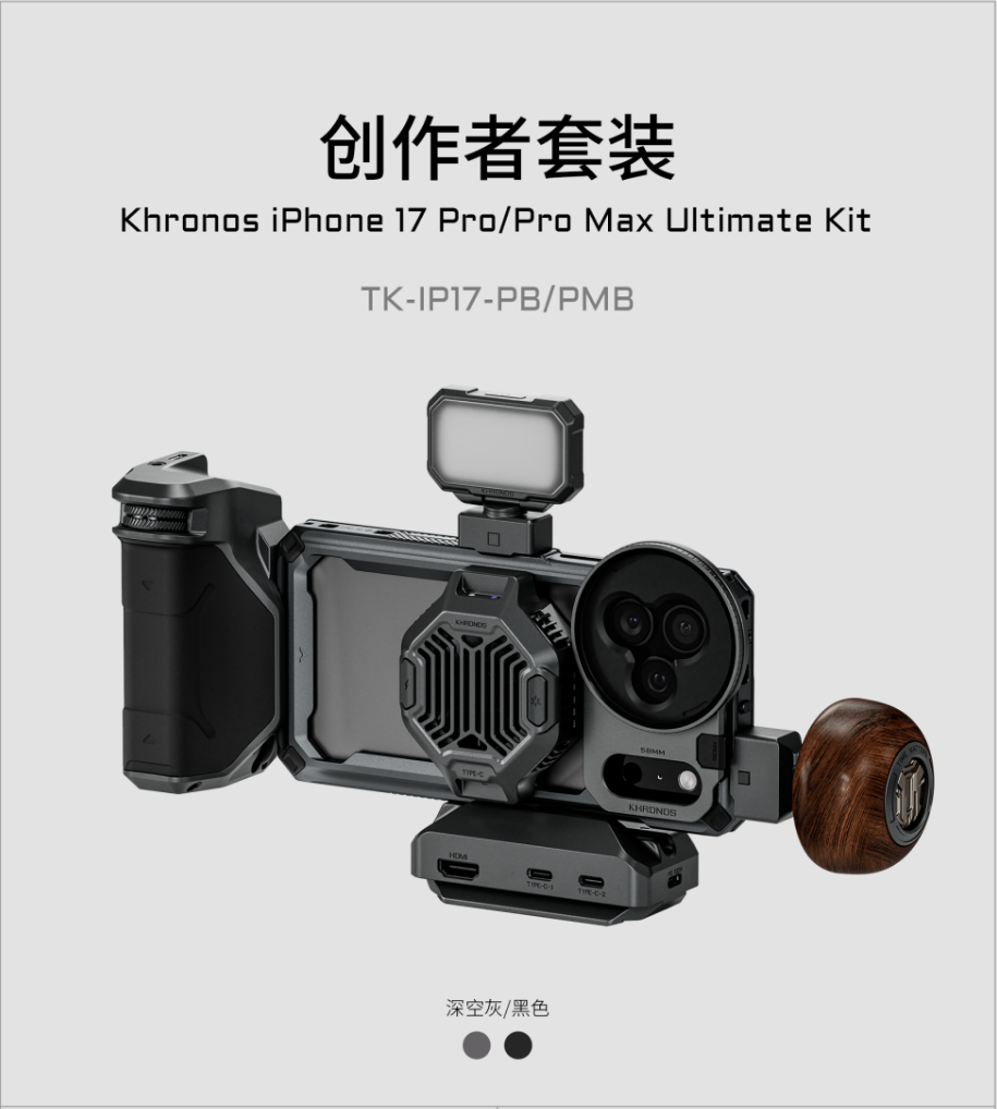 作为全球高品质摄影器材供应商,TILTA铁头又为iPhone17系列用户打造了KHRONOS陨时经典系列创作者套装: