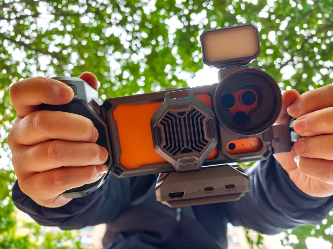 不仅可以兼容58mm磁吸滤镜,还可以通过背面磁吸面板加装散热器V2,但它没采用内走电设计,需要外接C口充电线。这个轻型套装更适合喜欢轻便、日常的手机摄影爱好者使用,旅游或外拍时随掏随用,便携性更强!
