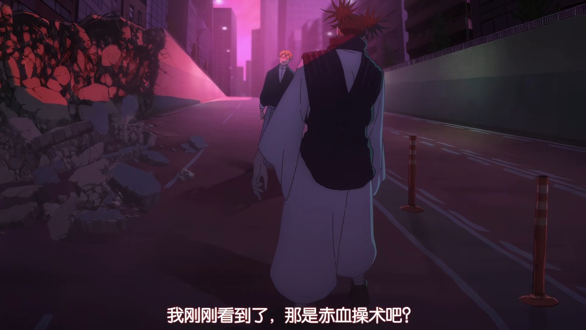 用到了和《电锯人 蕾塞篇》类似的演出效果,咒灵的血澎涌而出,将背景染上一抹奇幻色彩。