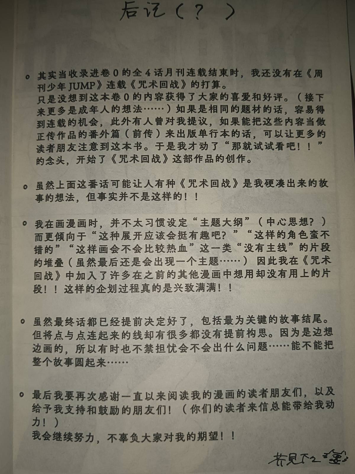 在《咒术回战 0》的后记中,芥见下下是这样说的:• 我在画漫画时,并不太习惯设定“主题大纲”(中心思想?)而更倾向于“这种展开应该会挺有趣吧?”“这样的角色蛮不错的”“这样画会不会比较热血”这一类“没有主线”的片段的堆叠(虽然最后还是会出现一个主题……)因此我在《咒术回战》中加入了许多在之前的其他漫画中想用却没有用上的片段!!这样的企划过程真的是兴致满满!!