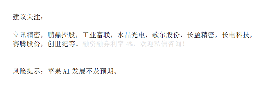 苹果WWDC发布全新个人化AI系统Apple Intelligence后,6.11日股价大涨超7%!今年以来我们持续强调重视苹果AI超级大周期,指出WWDC将为AI大周期做铺垫,过去几年苹果创新力度有限,销量增长乏力,苹果AI创新超级大周期启动有望扭转局势,产业链迎来新增长引擎!Apple Intelligence开启苹果AI新纪元WWDC 2024重点聚焦AI,Apple Intelligence将大模型能力引入siri和大量实用类app,并与OpenAI 合作将GPT-4o融入Siri和Writing Tools,带来直观、实用、易用的AI操作体验,同时通过私有云计算强化用户隐私保护,实现苹果AI终端落地,WWDC 2024有望成为苹果AI创新大周期起点。25/26年苹果创新大年24年苹果AI落地赋能终端,25/26年创新大年,芯片/光学/散热等硬件升级+AI耳机/二代MR/AR/折叠屏等新产品陆续推出+AI持续迭代,苹果AI超级大周期将带动整体产业链升级迭代。