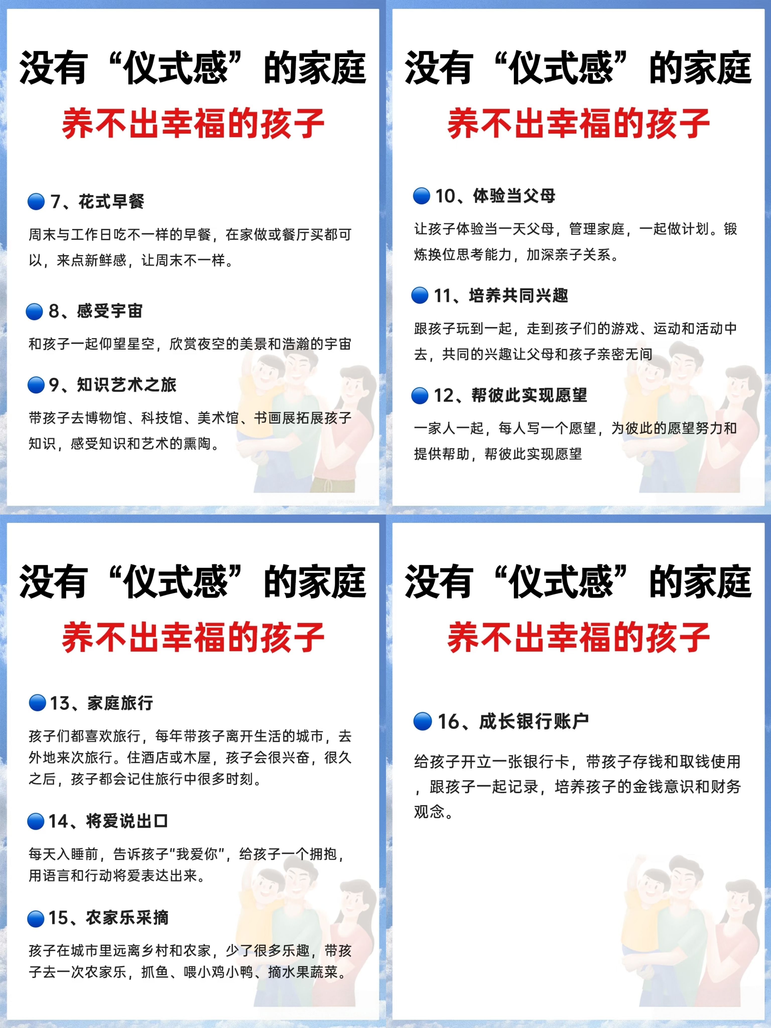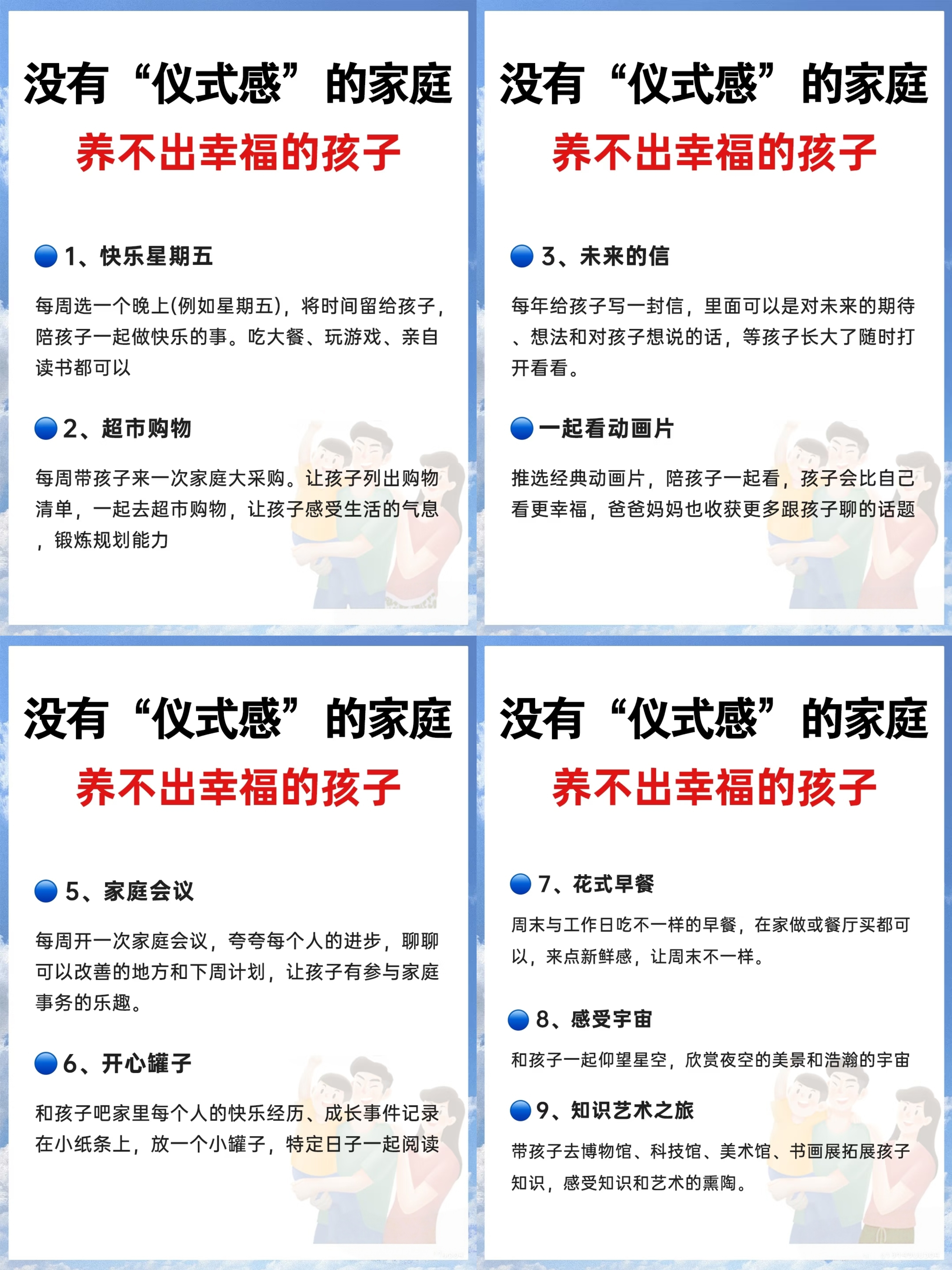 在家里选一个固定的角落,每年同一天穿上亲子装拍张全家福。配上小卡片,写下这一年每个人的感想。多年后翻看,那些被时间冲淡的回忆,会一下子鲜活起来。