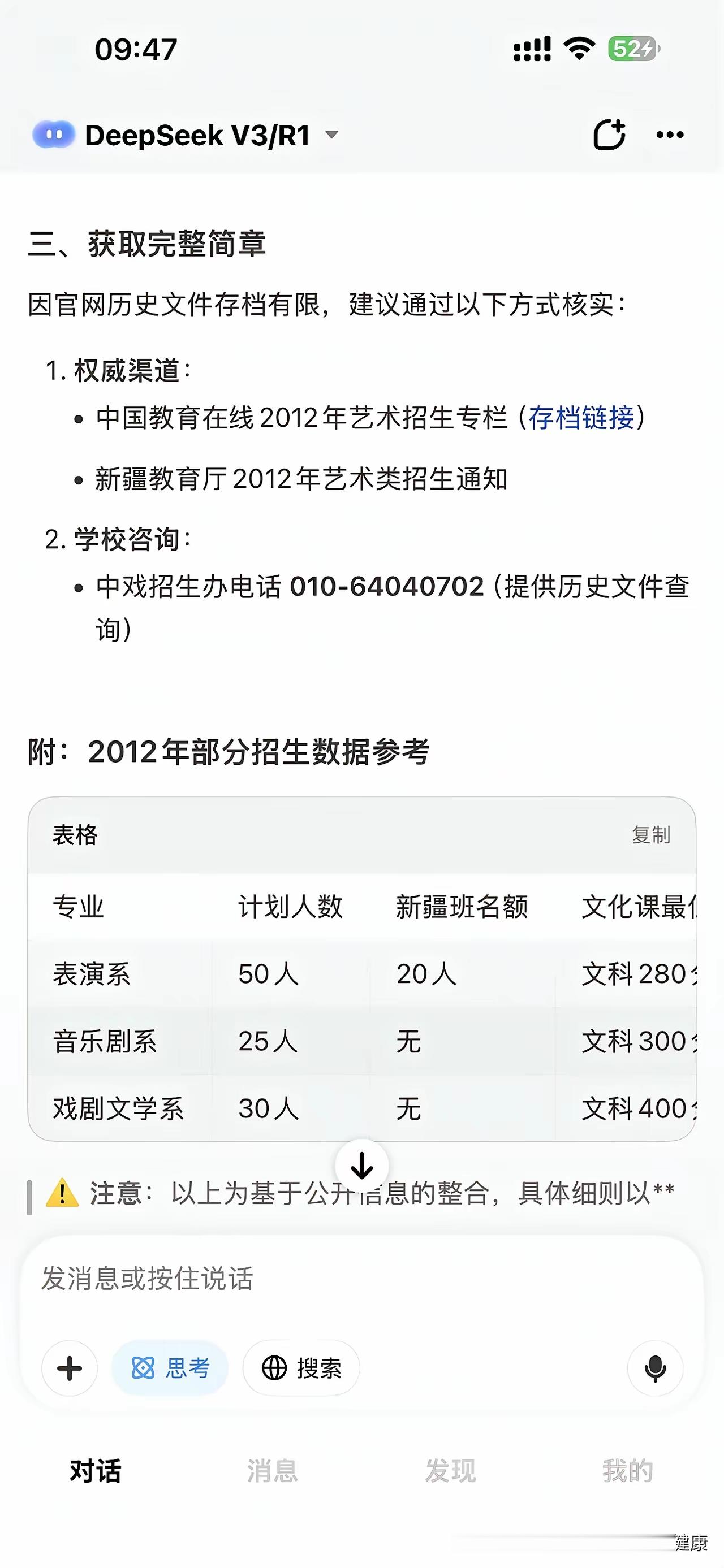 网友通过DeepSeek查找中戏2012年的招生计划,有新疆班;
