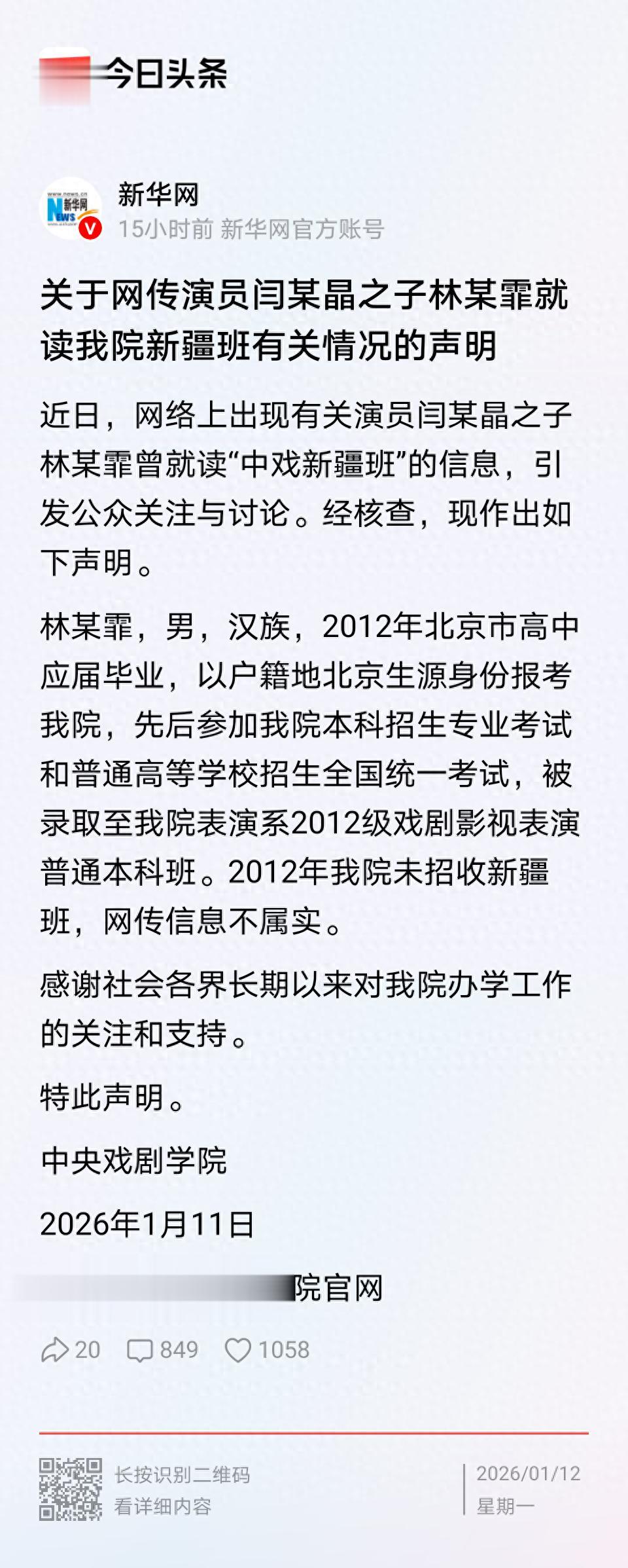 林某霏就读中戏应该是事实,中戏声明和网友掌握的资料都认可。具体的读的是2012年的那个专业需要更明确的材料来证明。无论如何,对2011年的两个汉族学生都需要调查清楚,才能消除疑惑,你说是不是?