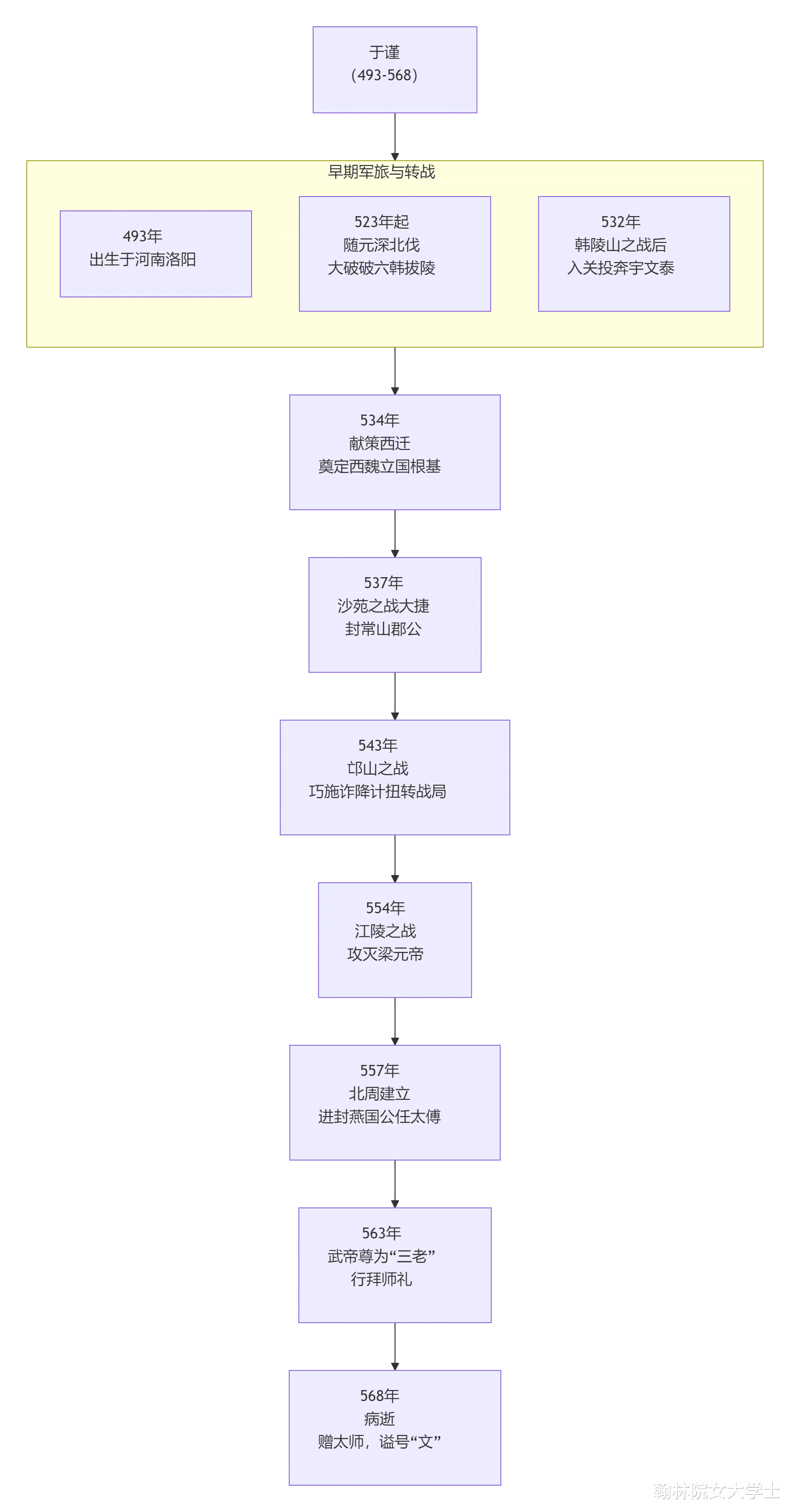 于谨是北周政坛的常青树,能文能武,他转战各地,参与了征讨葛荣、平定万俟丑奴等多次战役。他精准分析了当时的形势,认为魏室衰微,高欢是主要威胁,而关中地区地势险要、土地肥沃,是建立霸业的理想基地,在他的帮助之下宇文泰得以控制西魏政权。在东西魏连年战争中(沙苑之战、邙山之战、江陵之战),于谨多次担任前锋或中坚力量。