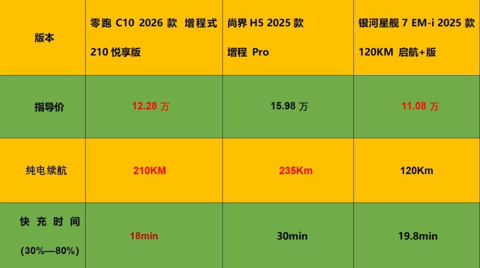 零跑C10定位中型SUV,具有纯电和增程可选,售价为12.28万-14.28万;尚界H5同样是中型SUV,同样也有纯电和增程可供选择,但是这款车的价格比较高昂,售价为15.98万-19.98万;再来看一下星舰7,这款车只有插混版车型,它的价格很亲民,9.78万-13.08万,但是星舰7定位紧凑级SUV,而且纯电续航为55km或者120km。相对而言,零跑C10和尚界H5的增程版纯电续航都在200+km。