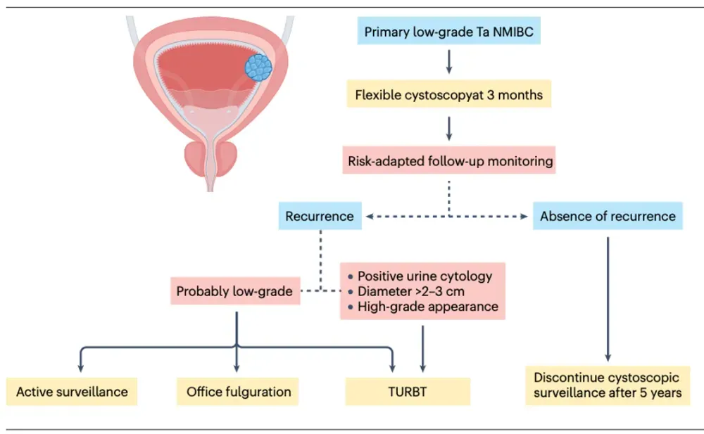 高复发率:LG-NMIBC最显著、也最容易被放大的特征从流行病学角度看,低级别非肌层浸润性膀胱癌(LG-NMIBC)的高复发特征十分明确。多项长期随访研究显示,约40–50%的患者在诊断后5年内会出现至少一次复发,且复发风险主要集中于随访的前5年。部分患者甚至会经历多次复发,这也使得复发成为临床随访过程中最为常见、最具标志性的事件之一。在这一背景下,当前临床实践逐渐形成了一种以密集膀胱镜随访为核心的管理路径:在常规随访中发现复发病灶后,往往倾向于通过经尿道膀胱肿瘤切除术(TURBT)进行处理。在这种管理逻辑中,“是否复发”常常被赋予较高的临床权重,并在很大程度上主导了后续干预决策。