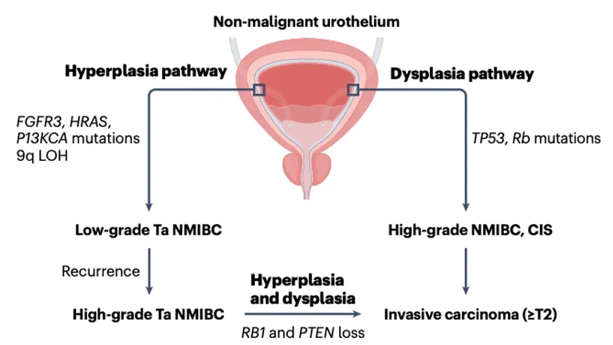 注:低级别NMIBC多由FGFR3、RAS、PIK3CA等促进细胞增殖相关通路的异常驱动,呈现出以表浅生长和反复复发为主要特征的疾病过程;而高级别NMIBC及肌层浸润性膀胱癌(MIBC)则常伴随TP53、RB1等关键抑癌基因异常,进而表现出更强的侵袭性和进展倾向。该图强调低级别NMIBC并非高级别肿瘤的“早期阶段”,而是一条具有相对独立生物学特征的致癌通路。