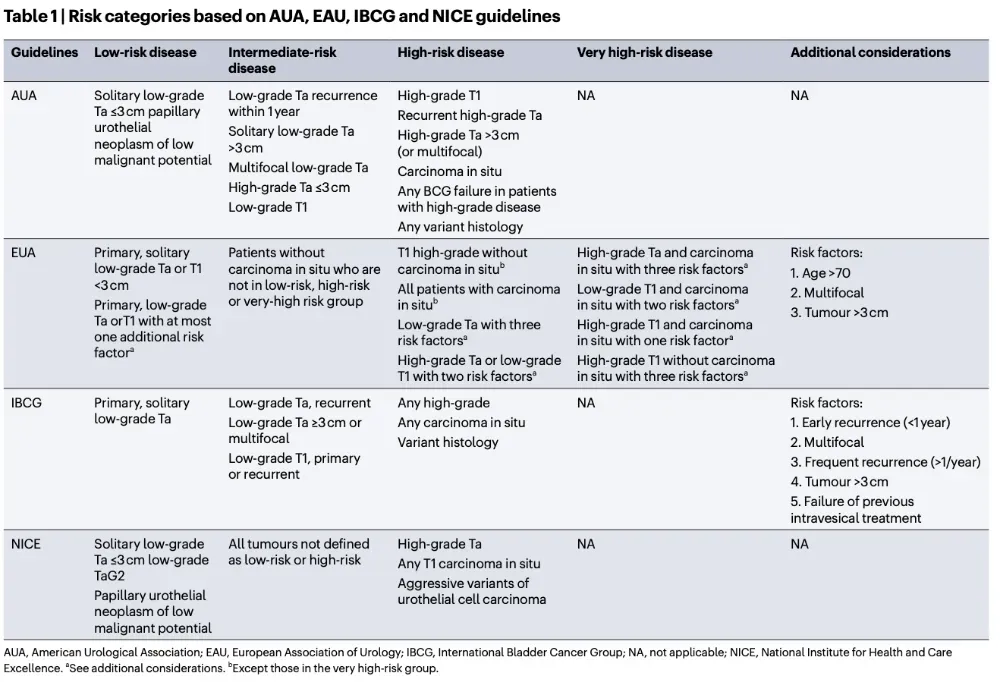 其次,在临床风险分层方面,目前并不存在一个被广泛接受、完全统一的框架。美国泌尿外科学会(AUA)、欧洲泌尿外科学会(EAU)以及国际膀胱癌研究组(IBCG)在低级别NMIBC的风险定义、复发风险评估以及“中危”患者的界定上均存在差异(表1)。这种差异并非纯粹的学术分歧,而是直接反映在随访频率、是否推荐膀胱灌注治疗以及何时升级干预等具体决策中。