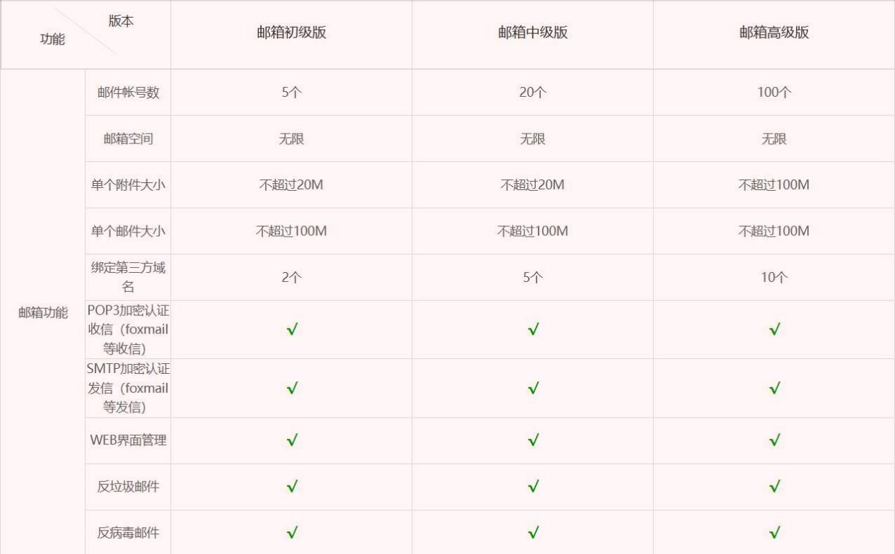 基础功能扎实:全版本均享无限容量,初级、中级版支持20M附件,高级版支持100M附件;邮件送达率达99.9%,反垃圾反病毒拦截率达99.8%,支持POP3加密收发,保障信息安全。