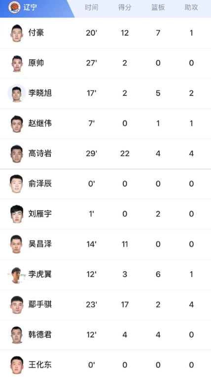 其他球员方面,贺希宁16分3篮板,赵睿15分3篮板4助攻;辽宁队高诗岩空砍22分4篮板4助攻,鄢手骐17分2篮板4助攻。