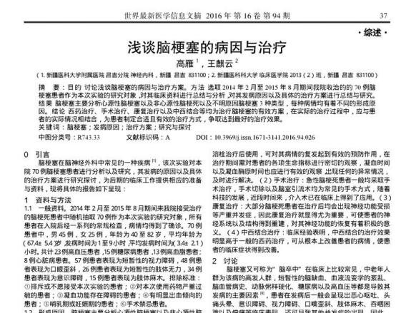 参考资料[1]高雁,王麒云.浅谈脑梗塞的病因与治疗[J].世界最新医学信息文摘,2016,16(94):37.