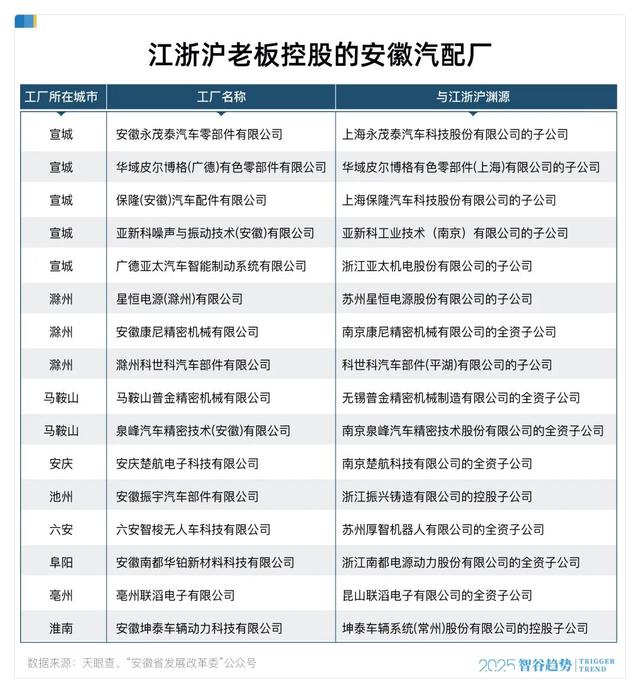 宣城是安徽汽车产业第三城,当地前十大汽配厂有五家是江浙沪企业的子公司。滁州、马鞍山、池州、安庆、六安,淮南、亳州、阜阳等地,也有江浙沪老板开办的汽配厂。