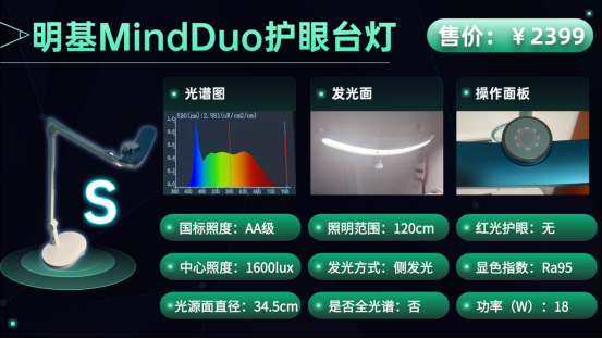 智能体验比较省心:支持入座自动亮灯、离座延时关闭,还有自动调光功能,能根据环境光调整亮度,孩子自主使用很方便。不过光谱连续性一般,蓝光峰值略突出,实测蓝光峰值高达1.0,长时间高强度用眼时,会出现视频疲劳现象,而且价格偏高,更适合预算充足、对进阶护眼需求不高的家庭。