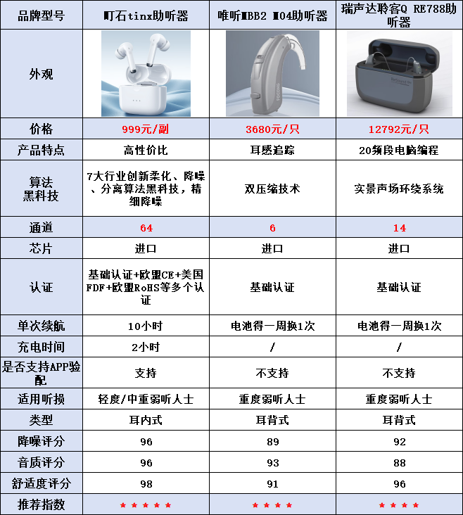 音质测评结果小结町石 > 唯听 > 瑞声达町石助听器音质测评表现町石的音质给人印象深刻,清晰度和细节都做得相当好。佩戴后,不管是跟人聊天还是听讲座,都不会有压力。声音清晰到近距离能听清楚每个字,远离一点也能轻松捕捉到声音的细节,音质还原得很自然,杂音几乎没有。它搭载了64通道技术和靶向高密度声源定位技术,配合P9声音处理模型,能够精准分离和还原语音。经过测试,它的音质真实度提高了99.5%,在同价位里表现优秀。唯听助听器音质测评表现唯听的音质表现算得上不错,清晰度和真实感都能满足日常需求。近距离听音时,声音还原非常自然,细节捕捉得也很到位,居家或办公室使用完全没有问题。它的自适应声音调节技术会根据周围环境的变化自动调整音质。不过,如果是远距离或者嘈杂环境,音质的细腻感可能会有所下降,偶尔会出现轻微的模糊,细节要求高的场合可能不太适应。瑞声达助听器音质测评表现瑞声达的音质表现整体偏平,清晰度、真实感和细腻度都没有特别突出。近距离的对话中,它能够听清楚核心内容,基本满足日常的听音需求。其内置的声频优化技术能提升一些人声的清晰度,但在嘈杂的环境或是播放音乐时,声音的还原效果就会下降,细节感不足。高频部分偶尔会出现轻微的失真,整体音质的表现还有待改进。