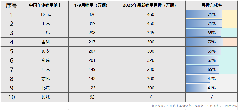 从销量前十车企的竞争格局来看,比亚迪与上汽集团共同占据第一梯队位置,1-9 月累计销量均突破 300 万辆。其中,比亚迪以 326 万辆的累计销量稳居行业榜首,已顺利完成其全年 460 万辆最新销量目标的 71%,凭借在新能源领域的技术优势与产品矩阵,持续巩固行业领先地位。上汽集团同期累计销量达 319万辆,全年目标完成率同样为 71%,在燃油车市场稳步推进、新能源车型加速布局的 “双线并行” 策略下,保持了稳健的增长节奏。