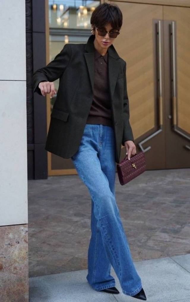 深绿色西装,利落剪裁自带干练气场,内搭棕色polo领针织衫,柔和质感平衡西装的硬朗;蓝色喇叭牛仔裤,复古版型增添随性松弛感,黑色尖头鞋,提升精致度,视觉上拉长腿部线条。既保留了穿搭的松弛感,又通过配饰细节提升了精致度。
