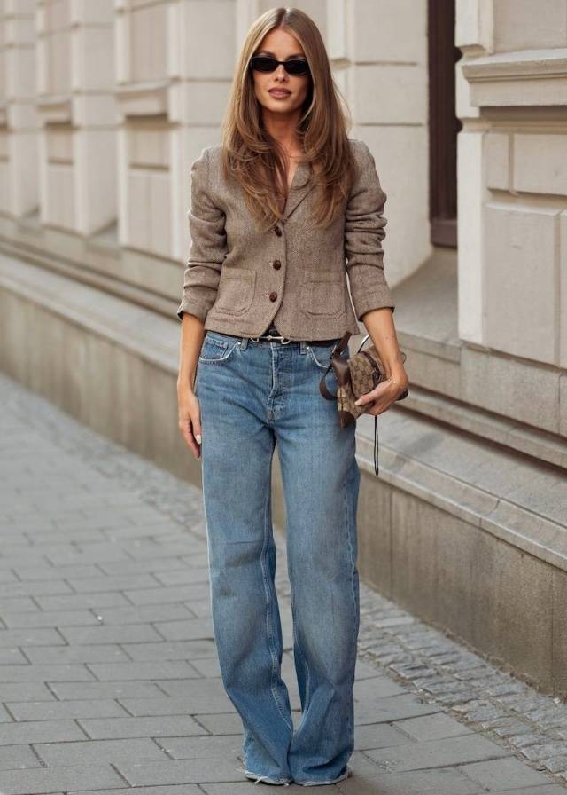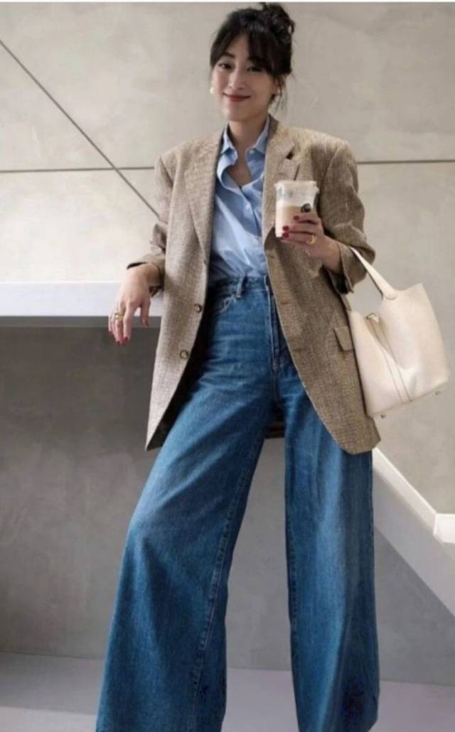 浅棕色格纹西装外套带正式感,内搭浅蓝色衬衫,搭配蓝色阔腿牛仔裤添休闲随性,实现“正式与休闲”的风格碰撞,既适合日常出街,也能适配轻职场场景。整体传递出“舒适不失品味”的日常穿搭氛围,展现出轻松自在又具时尚感的风格。