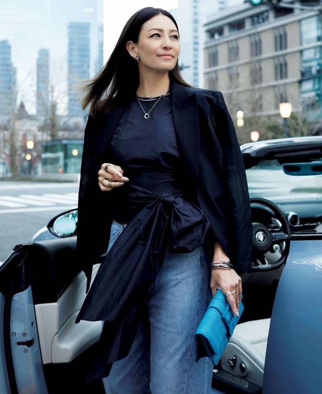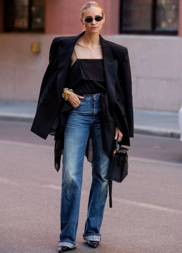 剪裁利落的黑色西装通常给人严谨印象,但廓形宽松的设计营造出余量空间更显舒适。加大的版型更能与休闲牛仔裤相得益彰,而垫肩设计则保持着端庄的整体格调。内搭选择纤细肩带的吊带背心,避免外套显得臃肿。点缀细项链与装饰性金手镯,兼顾华丽感。