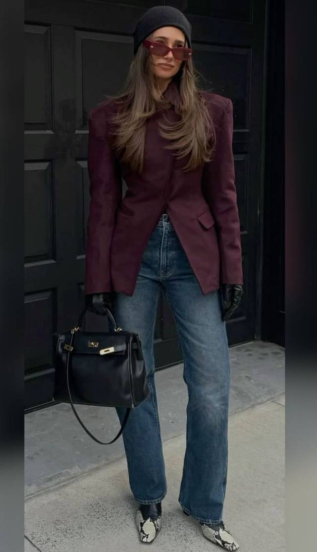酒红色廓形西装,内搭简约,搭配蓝色直筒牛仔裤,脚踩蛇纹印花短靴。头戴黑色针织帽,手戴黑色皮手套,手持黑色手提包,整体造型兼具复古与时尚感,营造出沉稳大气的氛围。