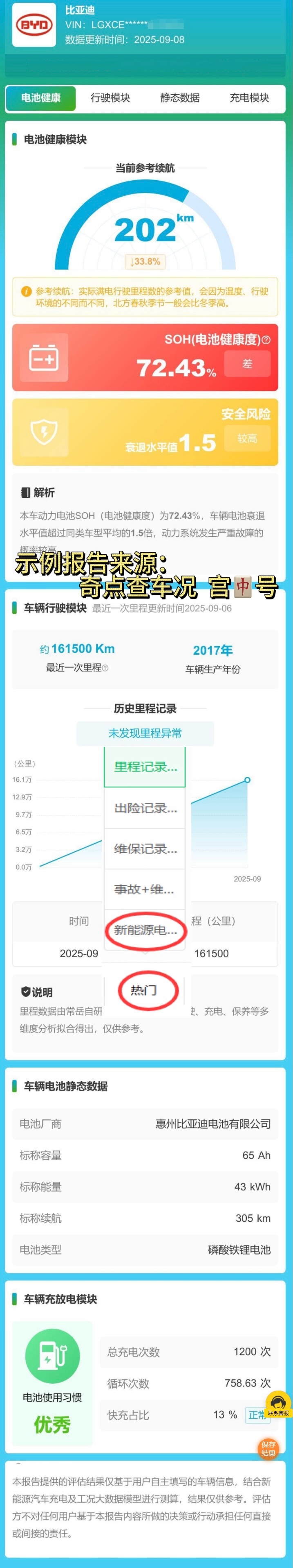 ②按照提示输入相关信息,平台会迅速整合多方数据,生成详细的报告包括:形式模块、静态数据、放电次数等等。(示例报告如下)