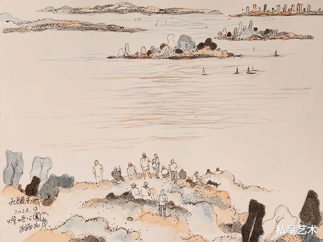 Ferries and cargo ships pass steadily, while small boats dart across the waves, scenes unfolding like brushstrokes in a living painting. In this summer I wandered here, sketching twenty moments of light and sea; ten now hang on this café wall, shared as an offering to fellow travelers.