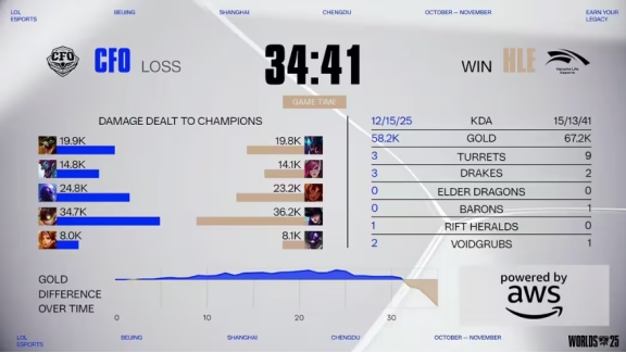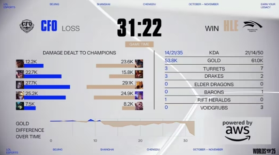 2025年10月22日,S15全球总决赛瑞士轮的赛场上,一场精彩绝伦的对决吸引了众多目光。HLE与CFO两支战队狭路相逢,展开了一场激烈的较量,最终HLE以2 - 0的比分击败CFO,成功晋级8强。
