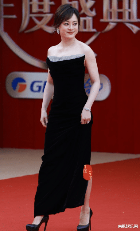 她一身抹胸黑色大裙摆开衩礼服,配上同色系的拉带高跟,一头黑长直好生靓丽。