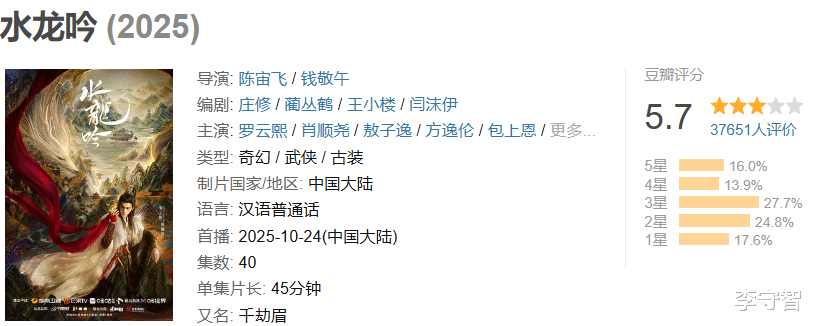 让人有点意外的是人气颇高的罗云熙新剧《水龙吟》,播出平台不错,宣发炒作不错,演员阵容不错,评分却不及格,仅有5.7分。看来剧情太老套,妆造也不行,把罗云熙整得像骷髅,确实影响观感。
