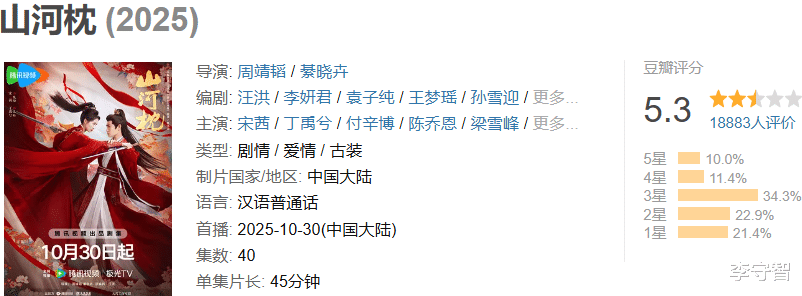 而丁禹兮与宋茜组合的《山河枕》,评分更低,才5.3分,两人其实能力不差,没想到这次反响这么差。看来在正剧路上转型成功的宋茜,不适合在古偶剧圈钱了。