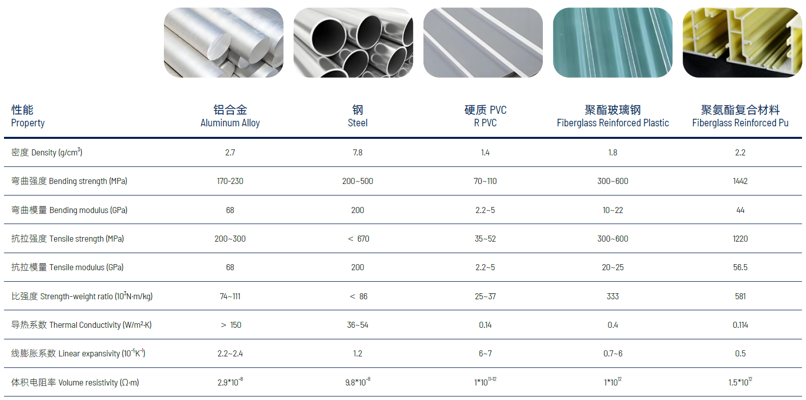 一、材料革新:超低导热,构筑节能基础玻纤聚氨酯复合材料,其核心优势之一在于优异的保温隔热性能。该材料的导热系数约为0.114 W/m·K,显著低于常见金属材料。这得益于聚氨酯树脂与玻璃纤维的协同作用:聚氨酯作为高分子材料,本身热传导阻力较大;玻璃纤维的加入,进一步阻隔了热量的传递路径。在实际应用中,这一特性有助于在冬季减少室内热量外泄,在夏季阻隔外部高温侵入,从而提升室内舒适度,降低空调与采暖能耗。搭配三玻两腔等节能玻璃配置时,整窗传热系数可控制在较低水平,满足低能耗建筑在热工性能方面的要求。