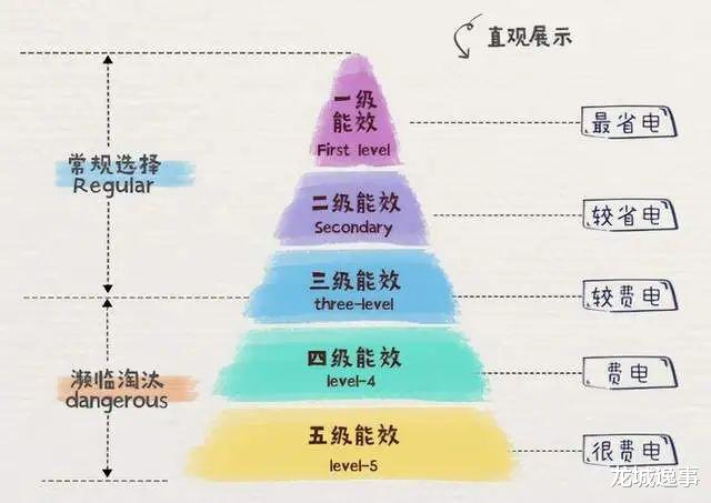 通常分为5个等级,等级1表示产品达到国际先进水平,节电,即耗能低;等级2表示比较节电;等级3表示产品的能源效率为我国市场的平均水平……