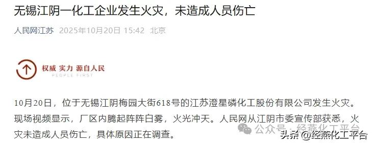 10月20日,据人民网江苏报道,位于无锡江阴梅园大街618号的江苏澄星磷化工股份有限公司发生火灾。